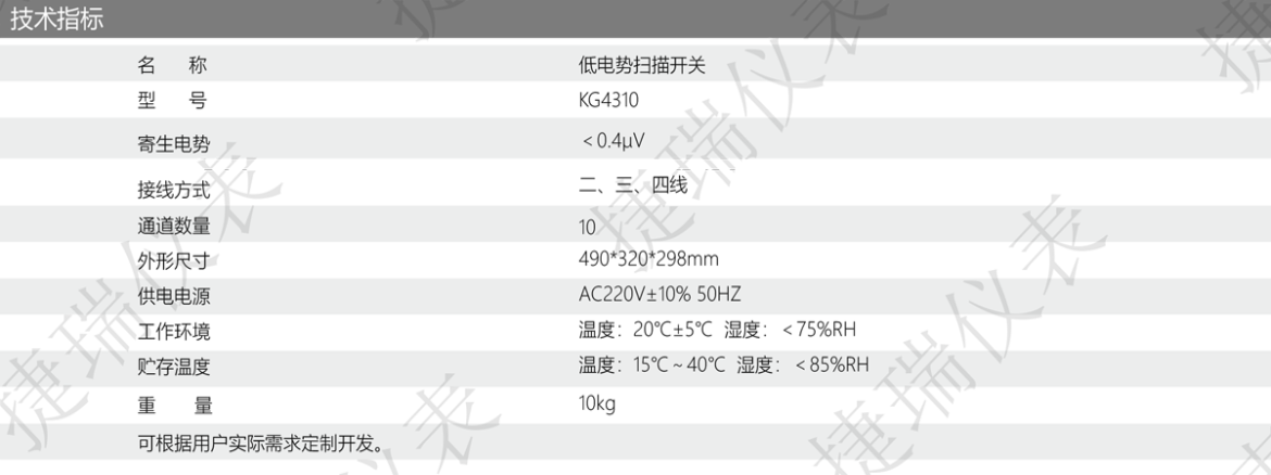 KG4310型低电势扫描开关是专门为热电阻、热电偶生产厂家的检定/校准研制生产的,是检定工业铂热电阻、工业铜热电阻、热电偶及各种被检体的辅助仪器。
